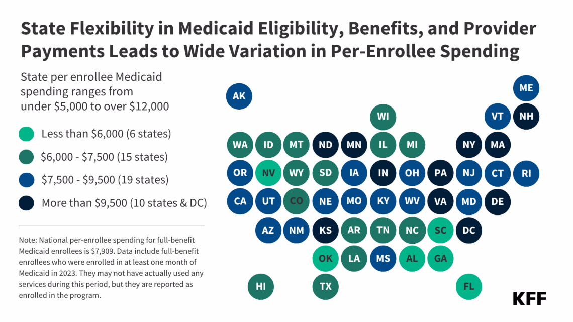 Data: The KFF State Health Facts on spending per full-benefit enrollee use the T-MSIS Research Identifiable Demographic-Eligibility and Claims Files (T-MSIS data). This data note is based on State Health Facts data from CY 2023.